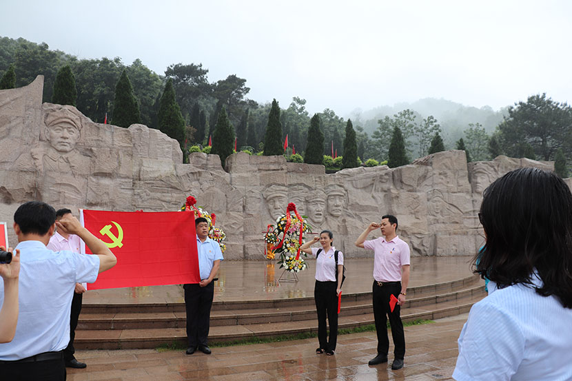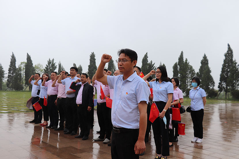 參觀完紀(jì)念館,一行人冒著大雨步行來到莊嚴(yán)肅穆的憑吊廣場,為革命先烈默哀致敬獻(xiàn)上花籃,表達(dá)了對革命先烈深切緬懷和無限敬仰。隨后,全體建昌黨員在黨支部書記伍初興的帶領(lǐng)下重溫入黨誓詞,追尋入黨初心,傳承革命精神。