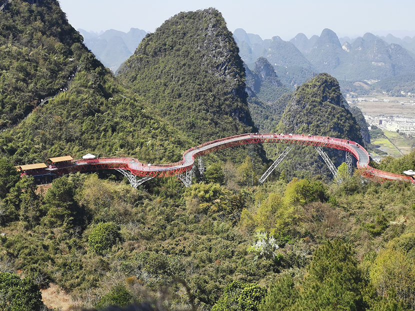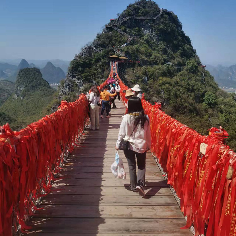 來到景區(qū),大家6人一組依次乘觀光索道登山,索道穿梭于群山之間的百米高空,讓人既害怕又興奮,大好風(fēng)光盡收眼底,一樣的層巒疊翠,不一樣的別致意境。下了索道,又開始了登峰之旅,棧道像游龍一般蜿蜒盤踞在群山之間,還有吊橋?qū)勺椒逑噙B,大家走走停停,不時駐足觀看,合影留戀,忘卻了煩惱也忘卻了時間,不知不覺已來到如意云頂觀景臺,這里視野開闊,俯瞰遠(yuǎn)方的美景,心情無比暢快!而后,大家來到了最考驗?zāi)懥康牟A5溃@里沿山壁懸空而建,往下望去是山崖深淵,讓人望而生畏。走在透明的玻璃棧道上,“膽大”的昂首挺胸大步向前,嬉嬉鬧鬧,“膽小”的駐足不前,惹來大家的“嘲弄”和轟笑。