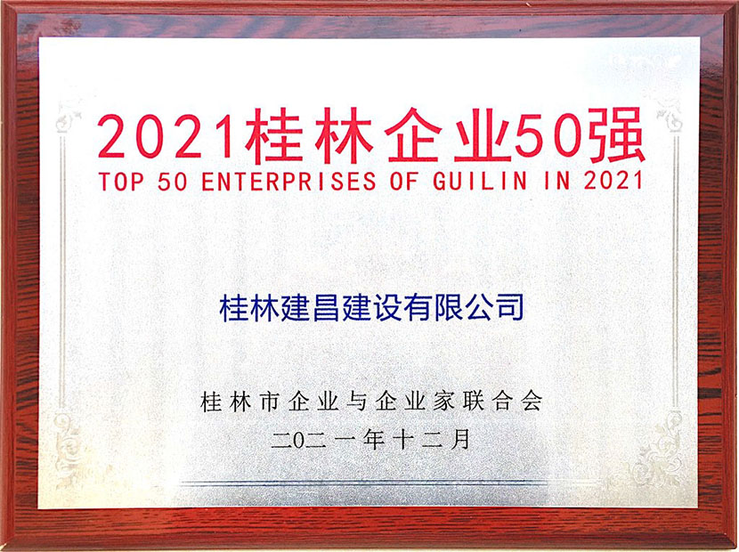 2021年12月22日,由桂林市工業(yè)和信息化局、桂林市工商業(yè)聯(lián)合會、桂林市企業(yè)與企業(yè)家聯(lián)合會共同主辦了“2021年桂林市企業(yè)家活動日”會議。會上公布了“2021桂林企業(yè)50強(qiáng)”、“上交稅收企業(yè)10強(qiáng)”、“制造業(yè)企業(yè)10強(qiáng)”、“服務(wù)業(yè)企業(yè)10強(qiáng)”等名單。桂林建昌建設(shè)有限公司榮耀登榜,榮獲2021年桂林企業(yè)50強(qiáng)第21名,較去年上升9名。
