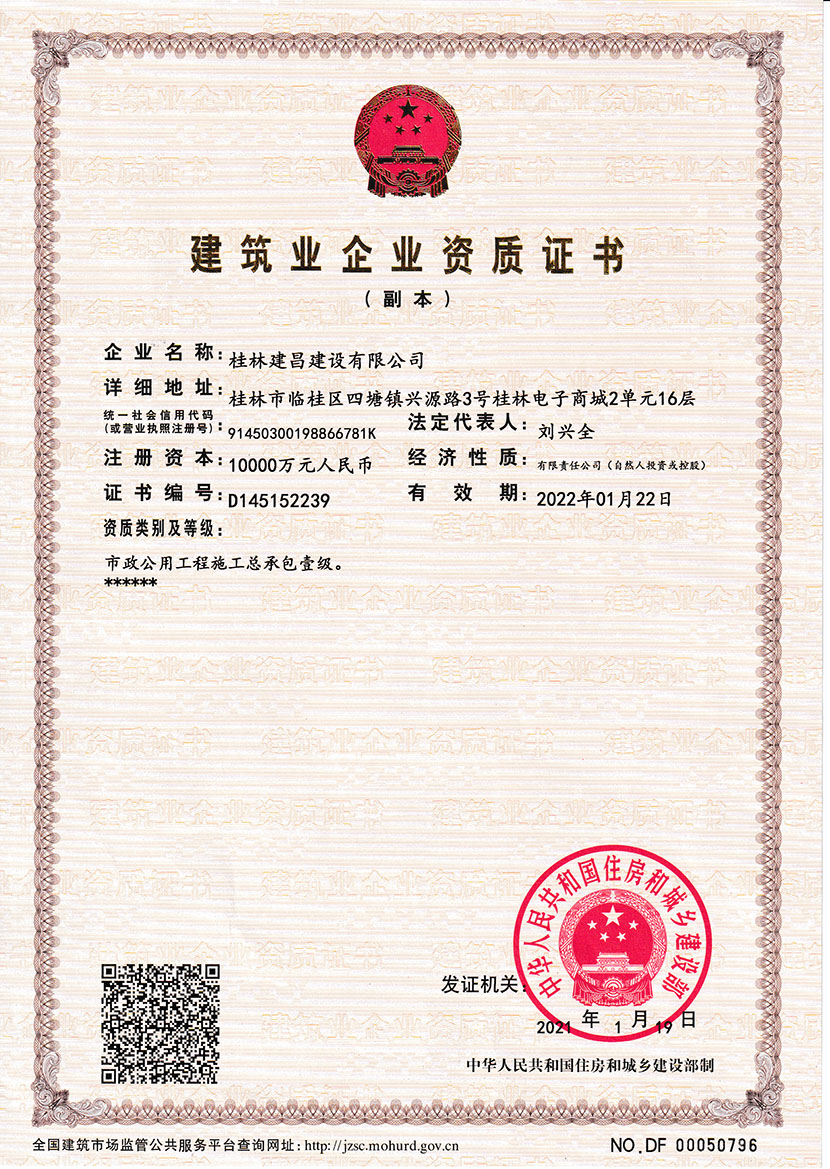 2021年1月,桂林建昌建設(shè)有限公司資質(zhì)升級(jí)工作獲得重大突破,經(jīng)國(guó)家住房和城鄉(xiāng)建設(shè)部批準(zhǔn),我司順利獲得市政公用工程總承包壹級(jí)資質(zhì)。這是建昌公司開年喜事,標(biāo)志著公司市政公用工程總承包水平步上了一個(gè)新的臺(tái)階,為公司進(jìn)一步開拓市政公用工程市場(chǎng),培育新的經(jīng)濟(jì)增長(zhǎng)點(diǎn),實(shí)現(xiàn)可持續(xù)發(fā)展奠定了堅(jiān)實(shí)的基礎(chǔ),是公司發(fā)展史上的又一里程碑。