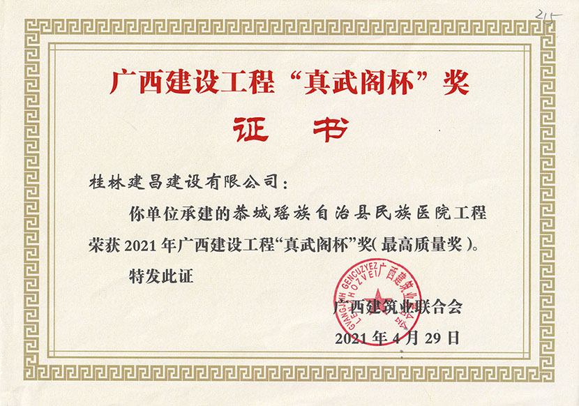 近日,2021年度廣西建設工程最高質量獎——真武閣杯獎評選結果揭曉。桂林建昌建設有限公司承建的恭城瑤族自治縣民族醫(yī)院和智慧養(yǎng)生城(瑤漢養(yǎng)壽城)1#、2#、3#、4#樓工程獲此殊榮。