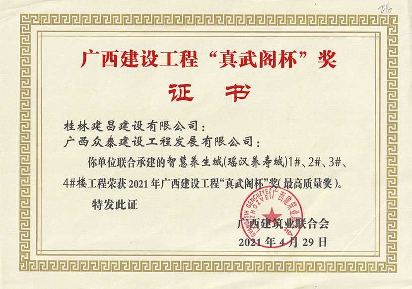 獲獎項目自開工建設以來,建立了完善的質量管理體系和保證體系,質量責任明確到人;對每道工序嚴格控制,做好樣板引路;狠抓過程控制,堅持開展質量周、質量月等主題活動;頒發(fā)并執(zhí)行嚴格的質量管理獎罰細則與驗收標準,量化質量管理等措施,始終把工程質量放在首要位置。在公司各級領導的關心和支持下,在質量安全管理部門和項目部共同努力下,智慧養(yǎng)生城(瑤漢養(yǎng)壽城)1#、2#、3#、4#樓工程獲得了廣西壯族自治區(qū)建設工程優(yōu)質結構獎榮譽。
