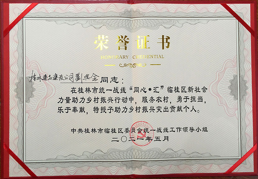 近年來,建昌公司積極參與助力脫貧攻堅(jiān)和鄉(xiāng)村振興活動(dòng),做出了積極貢獻(xiàn)。今年5月1日,建昌公司在桂林市統(tǒng)一戰(zhàn)線“同心·匯”活動(dòng)中再次捐贈(zèng)10萬元現(xiàn)金助力鄉(xiāng)村振興,并被授予助力鄉(xiāng)村振興“突出貢獻(xiàn)企業(yè)”榮譽(yù)。同時(shí),總經(jīng)理劉興全被授予助力鄉(xiāng)村振興突出貢獻(xiàn)個(gè)人榮譽(yù)。